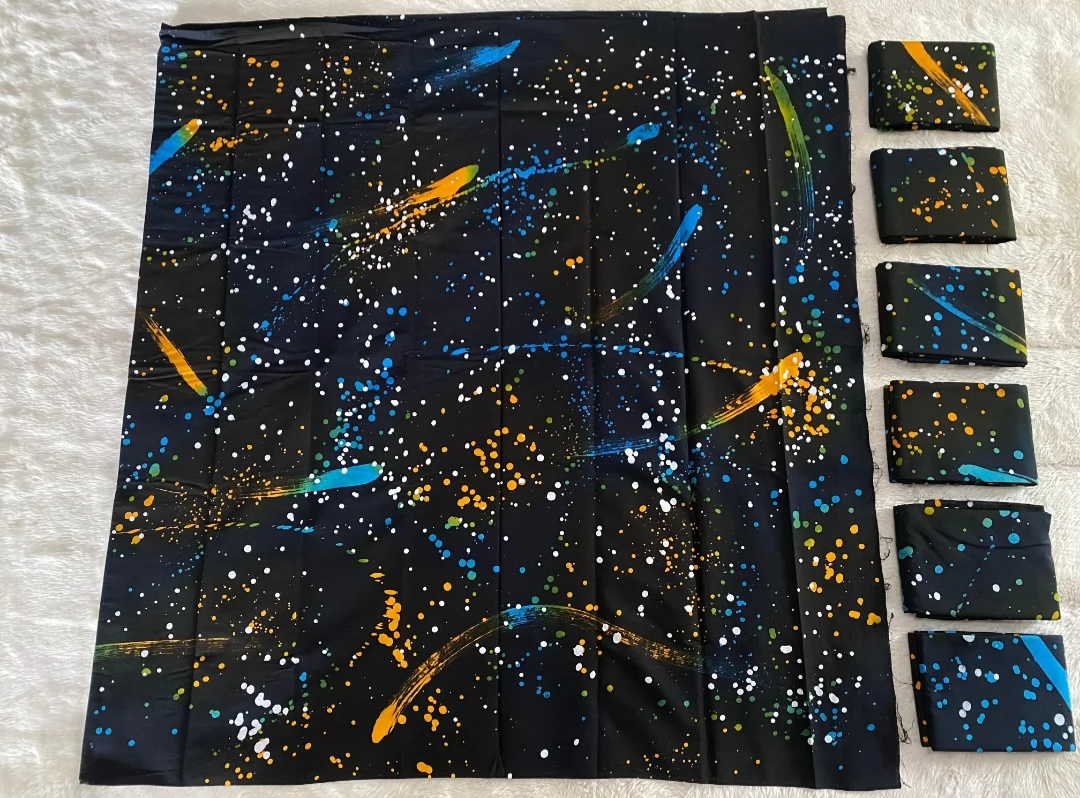 Motif ini terinspirasi dari teknik cipratan warna yang spontan namun tetap berpola, menggambarkan keberanian berekspresi dan keindahan dalam ketidakteraturan.